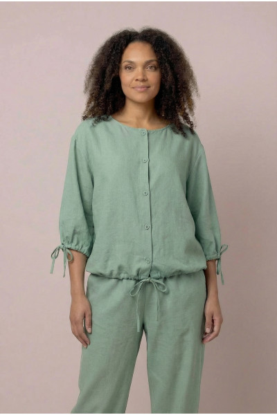 Модель у пастельному кольорі фісташки з віскози та бавовни (жатка). Легка, приємна до тіла тканина, гудзики спереду, вкорочені рукави та низ на кулісках — комфортна й універсальна блуза для щоденних образів.