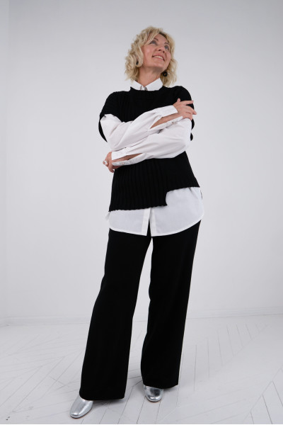Елегантні класичні прямі брюки, виконані з високоякісного трикотажу, що містить 50% вовни. Чорний колір надає їм універсальності, а м'яке полотно забезпечує комфорт протягом усього дня. Зручний еластичний пояс підкреслює силует та гарантує ідеальну посадку. Брюки також оснащені кишенями, що додає практичності. Ідеальний вибір для будь-якої нагоди — від офісу до зустрічі з друзями!