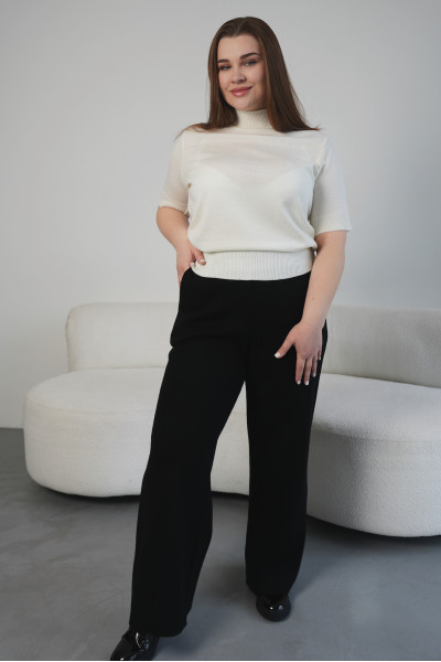 Елегантні та дуже теплі класичні прямі штани, виконані з високоякісного жакардового трикотажу, що містить 50% вовни. Є досить зручні кишені. Чорний колір надає їм універсальності, а м'яке полотно забезпечує комфорт протягом усього дня. Зручний еластичний пояс підкреслює силует та гарантує ідеальну посадку. Ідеальний вибір для будь-якої нагоди — від офісу до зустрічі з друзями!