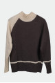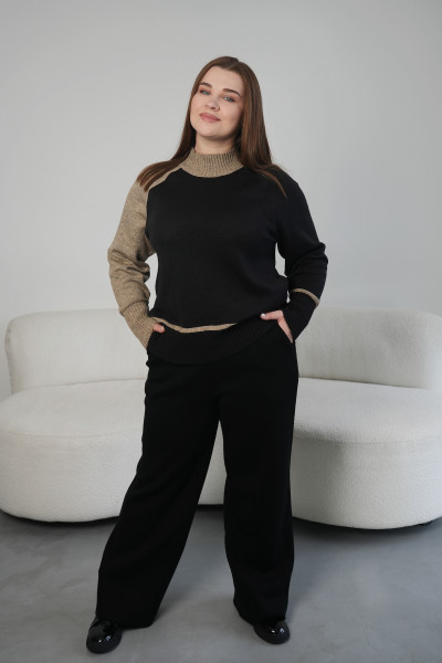 Светр, виготовлений з 70% вовни, стане чудовим доповненням вашого гардеробу. Основний чорний колір надає йому елегантного вигляду, а рукава та смужка у нижній частині кольору кемел додають стильного контрасту. Комбіноване полотно різного кольору створює цікавий візуальний ефект, роблячи светр справжньою прикрасою будь-якого образу. Чудово поєднується з нашими брюками 843 чорний та джинсами.