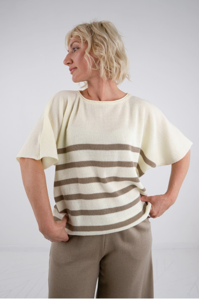 Джемпер у молочному кольорі в смужку "какао", чудово пасуватиме до наших трикотажних брюк 843, а також до спідниці, джинсів.