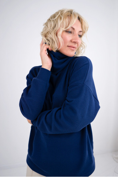 Однотонний гольф базового кольору під горло. Вільного фасону з маленькими бічними розрізами, ідеально пасуватиме до наших трикотажних брюк N843 та ваших улюблених джинсів. Ви почуватиметеся в ньому дуже комфортно, тепло та зручно.
