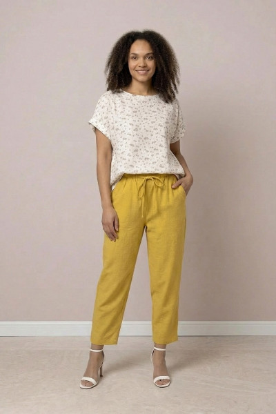 Штани з легкої, приємної до тіла тканини — стильний та зручний варіант на щодень. Модель із кишенями, пояс на резинці з додатковою вставленою мотузочкою для регулювання посадки. Завужений крій красиво підкреслює силует і додає акуратності образу.