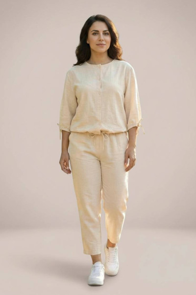 Ванільні штани з легкої, приємної до тіла тканини — стильний та зручний варіант на щодень. Модель із кишенями, пояс на резинці з додатковою вставленою мотузочкою для регулювання посадки. Завужений крій красиво підкреслює силует і додає акуратності образу.