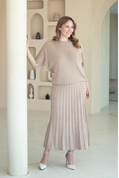 Дана спідниця плісе з в'язаного трикотажу поєднує комфорт і стиль у одному виробі. Завдяки еластичному поясу, вона ідеально сидить по фігурі, надаючи зручність протягом усього дня. Її довжина міді робить спідницю універсальним вибором для різних стилів – від повсякденних до більш елегантних образів. Ідеально поєднується з джемпером N2109-25 такого ж кольору