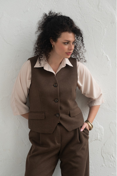 Вкорочений жилет із теплої костюмної тканини — стильний акцент у гардеробі на прохолодну пору. Модель виконана у трендовому кольорі капучино, який легко поєднується з базовими відтінками. Жилет застібається на три гудзики, має лаконічний крій і чудово тримає форму. Ідеально підходить як для повсякденних, так і для більш елегантних образів у багатошарових стилізаціях.